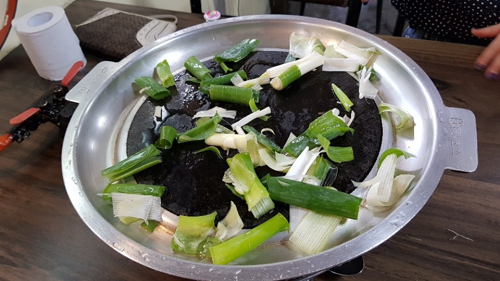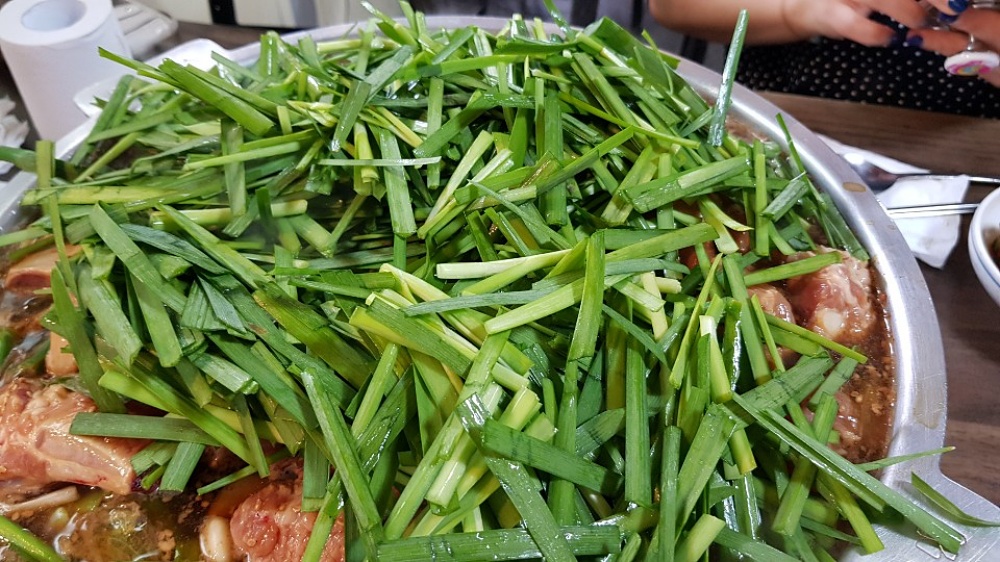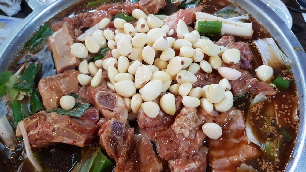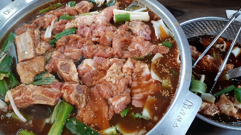 메뉴는 이제 돼지갈비. 물갈비가 전부인데, 생각보다 양이 좀 많은 편이다. 우선, 달궈진 불판 위에 파를 올려 파의 단맛을 살짝 끌어올리고 난 다음에, 비법간장에 담궈진 물갈비를 투하하면 되는데, 역시나 물갈비라는 이름에 걸맞게 국물이 가득하다.