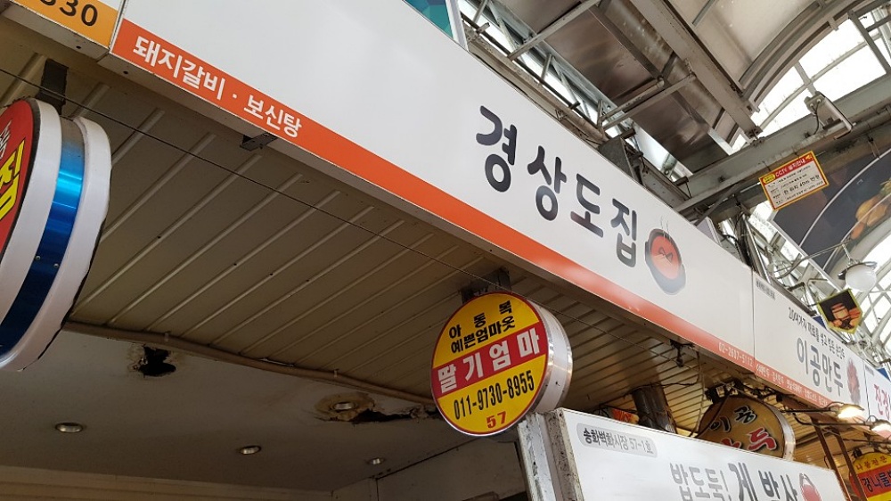 시장 한켠에 위치한 경상도집은 찾기가 힘들다. 그러니, 여기저기 좀 돌아다녀볼 필요가 있는데, 시장이 그렇게 크지는 않으니 걱정하지 않아도 된다. 그리고, 경상도집 간판에 '보신탕' 이라고 있는데, 최근에는 하지 않고, 물갈비 하나만 하고 계신듯 하다.