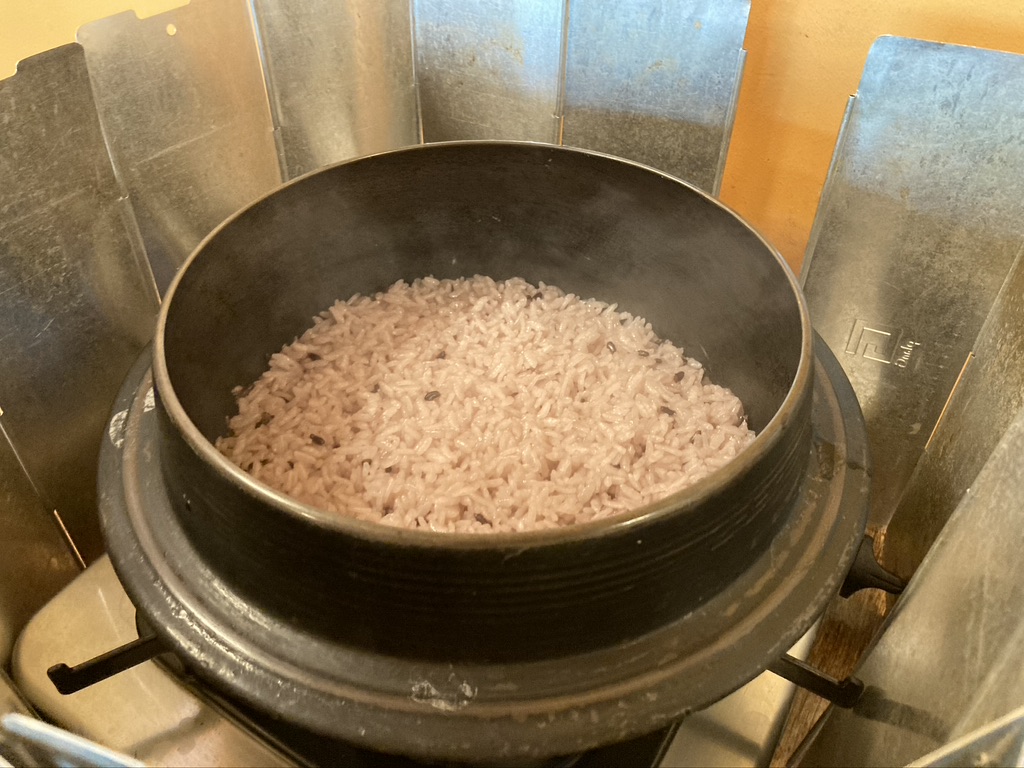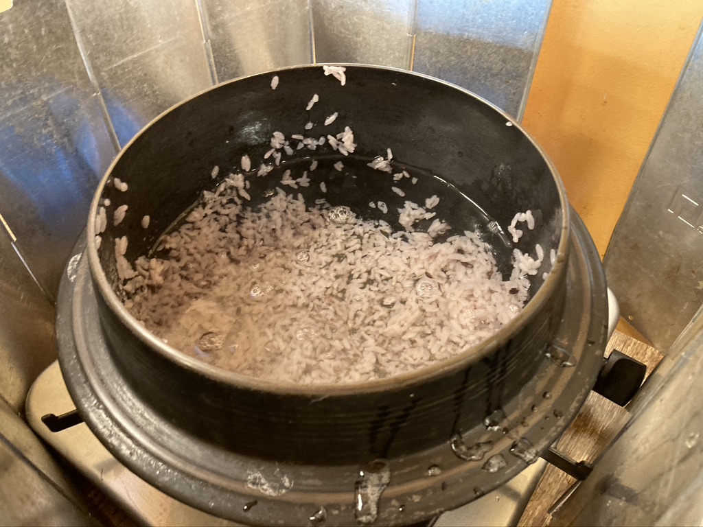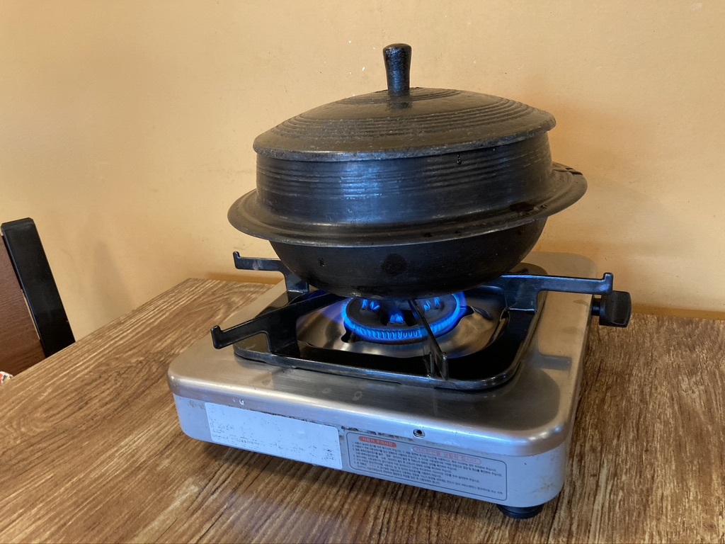 자리에 앉자마자 인원수에 맞춰 가마솥 밥을 바로 지어준다. 사실 이 부분이 놀랐다. 가마솥밥이라고 해서 그냥 가마솥에서 바로 한 밥을 담아줄 줄 알았다. 하지만, 그 자리에 바로 밥솥을 앉혀놓고 밥을 해주는 모습이 꽤 놀랍다.