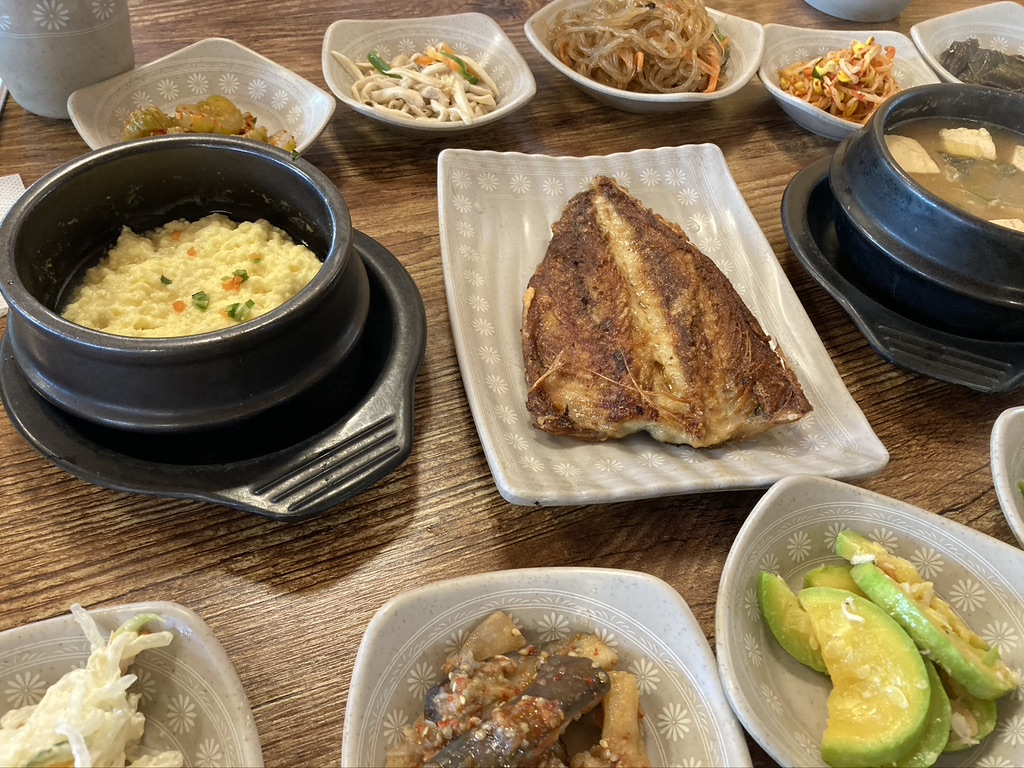 밥이 다 되는 동안 약 20분~30분 정도가 걸리며, 반찬으로는 천사채 샐러드, 가지무침, 김치, 애호박나물, 계란찜, 된장찌개, 고추무침, 콩나물, 오이지, 잡채 등등 14가지의 국과 반찬이 나오다보니, 양이 참 많아서 좋다. 된장찌개는 한술 뜨자마자 눈이 절로 감겨오는 맛에, 계란찜이 짭쪼롬하고 보슬보슬해 맛있고, 고등어는 바짝 구워나와서 큰 뼈만 바르고 대충 씹어먹어도 될 정도이다. 나머지 반찬들은 모두 간도 적당하고 꽤 맛있다.