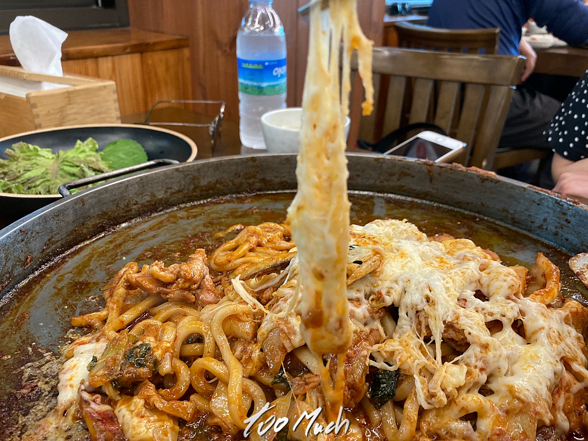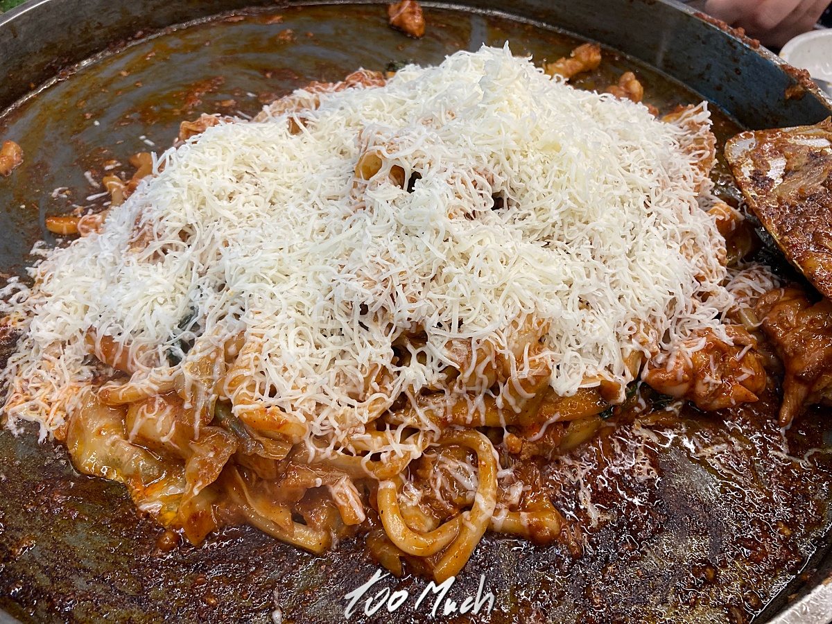 우동사리까지 더해진 닭갈비 위로 뿌려진 눈꽃치즈와 함께 먹는 닭갈비는 정말 맛있닫.