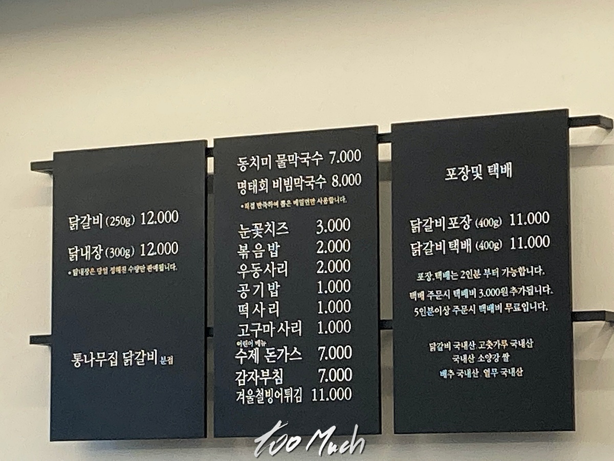통나무집닭갈비의 가격은 다음과 같다. 막국수도 먹고 싶었는데, 닭갈비 2인분만 먹어도 배가 부를 것 같았다. 닭내장도 먹고 싶었는데, 아쉽게도 다음에 먹을 계획이다. 그리고 막국수도. 맛보기로 먹을 수 있게끔 있으면 더 좋기도 할 것 같다. 입 짧은 사람들도 있으니 말이다.