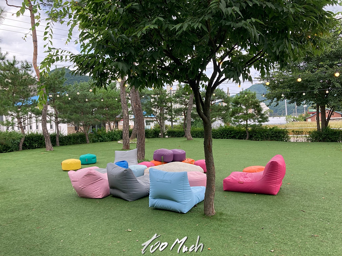 웨이팅이 좀 있는데, 밖에서 이런 빈백에 앉아있어도 되고, 일반 테이블 책상에 앉아있어도 된다. 넓은 공간이 꽤 여유로운 편이다. 참고로, 통나무집닭갈비 근처를 보면, 이디야 커피, 소소록 카페 등이 보이는데, 통나무집 숯불닭갈비, 이디야 춘천소양간점, 소소록카페 등 모두 통나무집닭갈비에서 직접 운영하는 패밀리 스토어라고 한다. 참 대단하다.