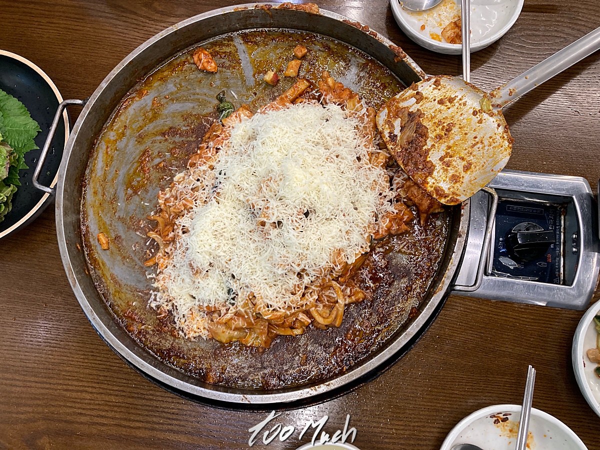 우동사리까지 더해진 닭갈비 위로 뿌려진 눈꽃치즈와 함께 먹는 닭갈비는 정말 맛있닫.