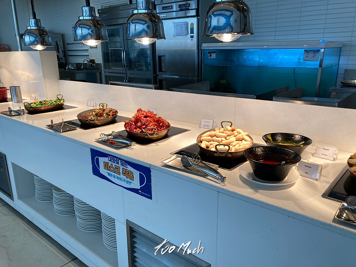 그리고, 주변 상권이 거의 없으며, 맛있는 식당 역시 없다. 근처 식당은 한참을 기다려야 하거나, 가격이 비싸고 맛은 뭐 그냥 그렇다. 근처 수산시장에서 회나 기타 먹을 것들을 챙겨와서 저녁을 먹는 것을 추천하며, 조식 역시 누가 결제해준게 아니라면 잠을 더 자고서 맛있는 해장국집 혹은 다른 아침식사가 가능한 식당을 알아보는 것을 추천한다. 조식은 많이 아쉽다. 그래도 바다를 보며 숙박을 할 수 있다는 점이 꽤 좋다.