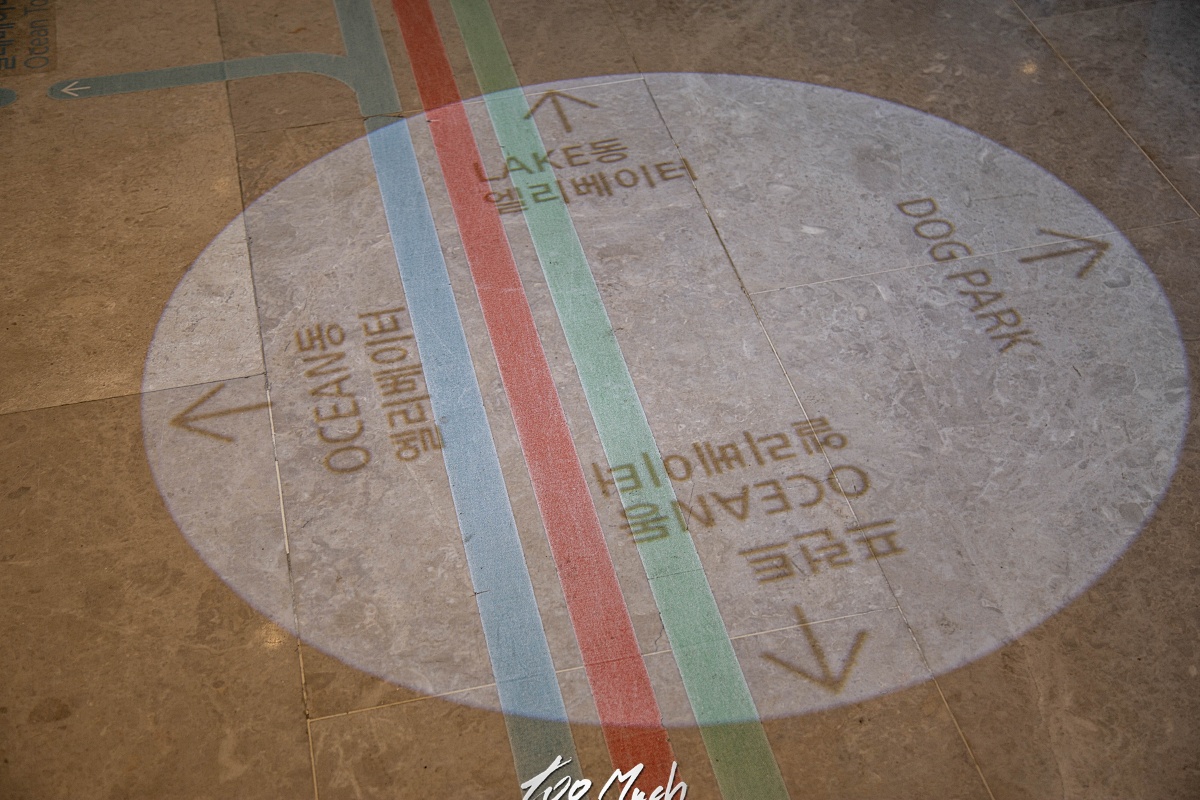 호캉스로 가도 괜찮을 만한 곳인데, 바로 앞에 해수욕장과 모래사장이 위치해 있으며, 호텔 내 시설이 다양하게 있다. 호텔 내 부대시설들은 아시다시피 비싸다. 그리고, 객실이 워낙 많다 보니, 안내방법이 독특한데, 이렇게 빔프로젝터로 컬러별 구분을 두어 쉽게 객실을 찾아갈 수 있었다.