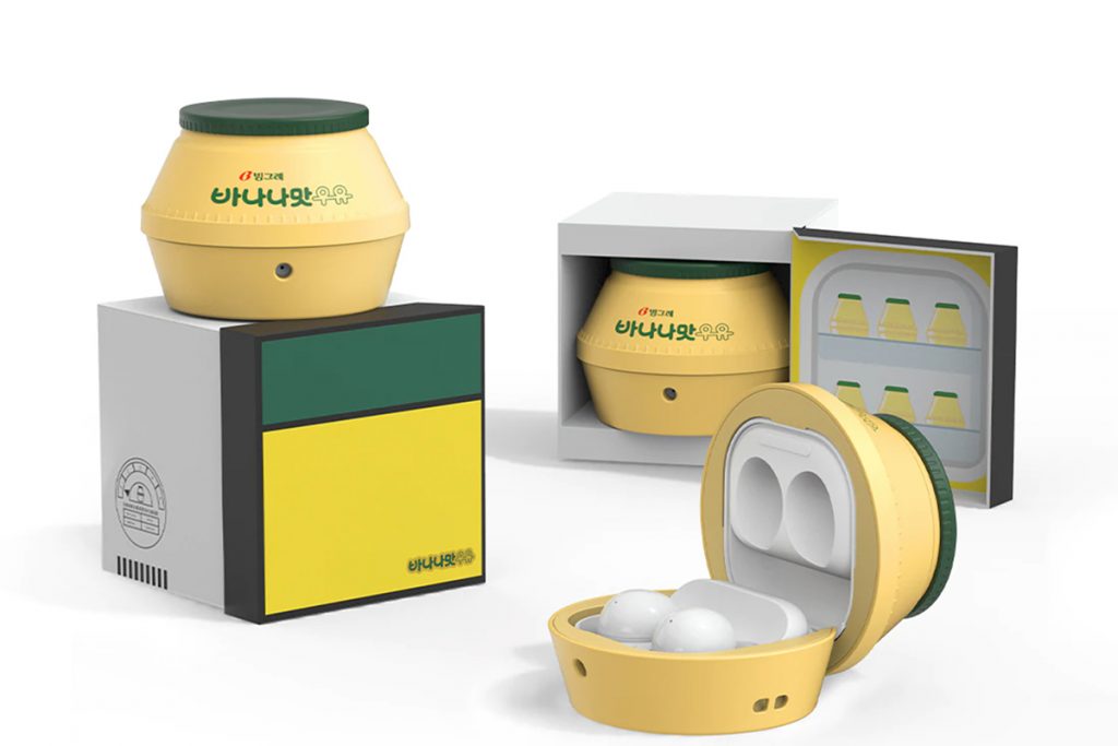 삼성 갤럭시 버즈 2가 이번엔 색다른 케이스 제품을 선보였다. 빙그레와 콜라보레이션을 진행했는데, 전통의 바나나맛 우유 모양을 닮은 노란색 몸통에 그린 컬러의 뚜껑까지 그대로인 단지 케이스는 삼성 비스포크 냉장고 모양과 함께 냉장고 안에 들어있는 단지 우유라는 컨셉으로 패키지를 아주 잘 해놓았다.