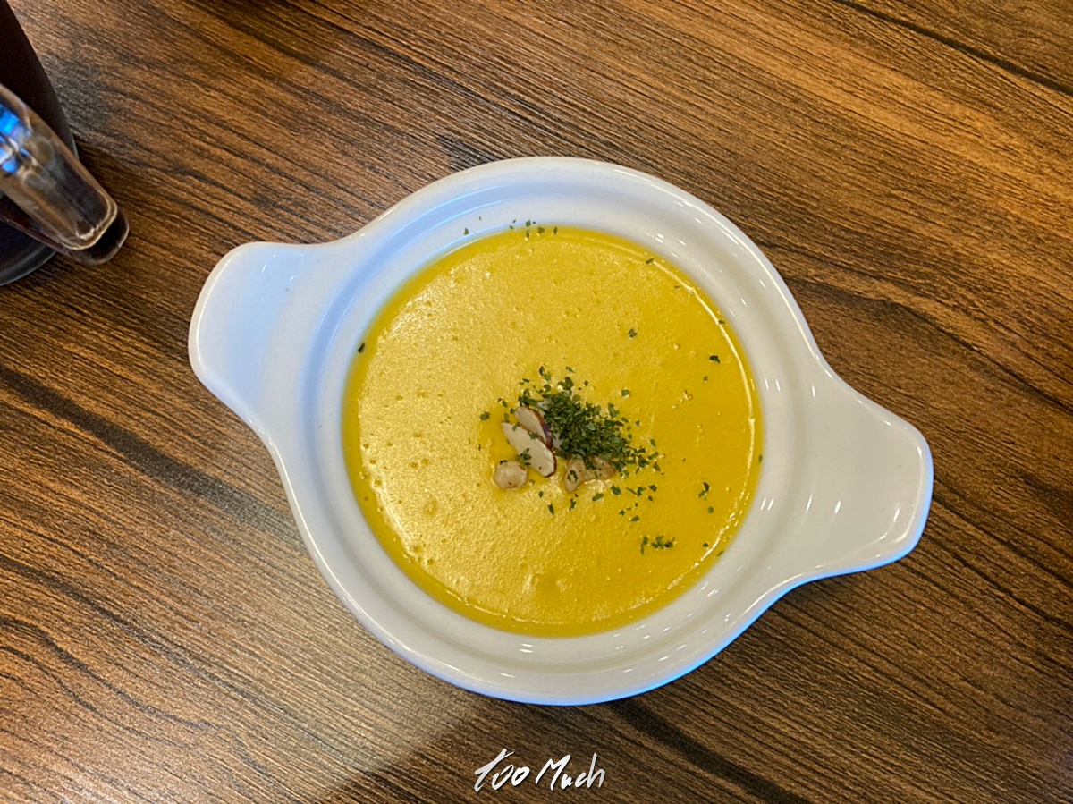 런치세트로 주문을 했고, 오늘의 스프로 단호박 스프가 나왔다. 그리고, 마늘바게트가 함께 나왔었는데, 모두 맛있었다. 단호박 스프는 너무 달지 않아 적당한 맛으로 속을 감싸고 식욕을 돋궈주고, 마늘바게뜨는 이것 하나만으로도 충분히 맛있었다.