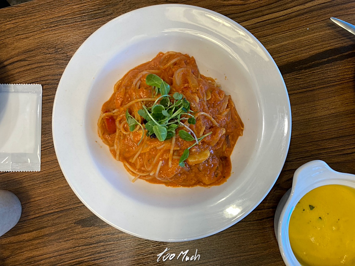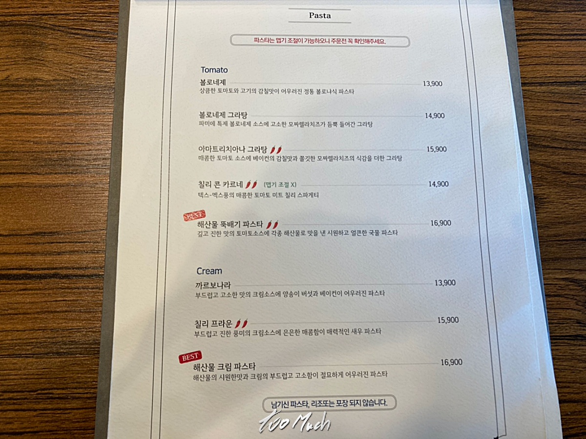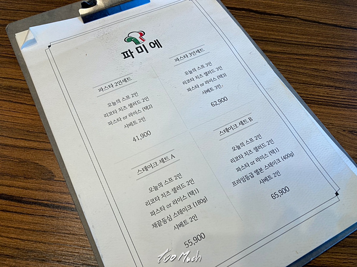 메뉴는 꽤 많은 편인데, 브런치가 가능하게 런치 세트가 있으며, 파스타 2인세트 등 다양한 메뉴가 있고, 파스타가 역시 주 메뉴이다.