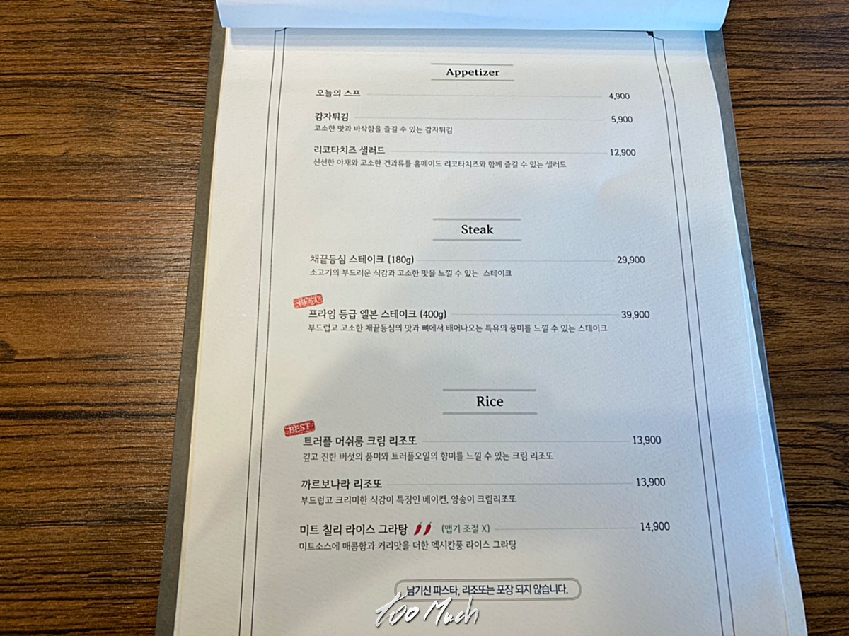 이렇게 로제파스타까지 와이프와 함께 먹고 나니, 다른 메뉴들이 궁금해졌다. 다른 사람들이 먹은 메뉴들을 보니 하나같이 다 맛있어보였고, 재료손질과 함께 요리의 완성도가 높아 저녁에 스테이크를 도전해도 충분히 맛있을 것 같다는 기대를 하게 된다.