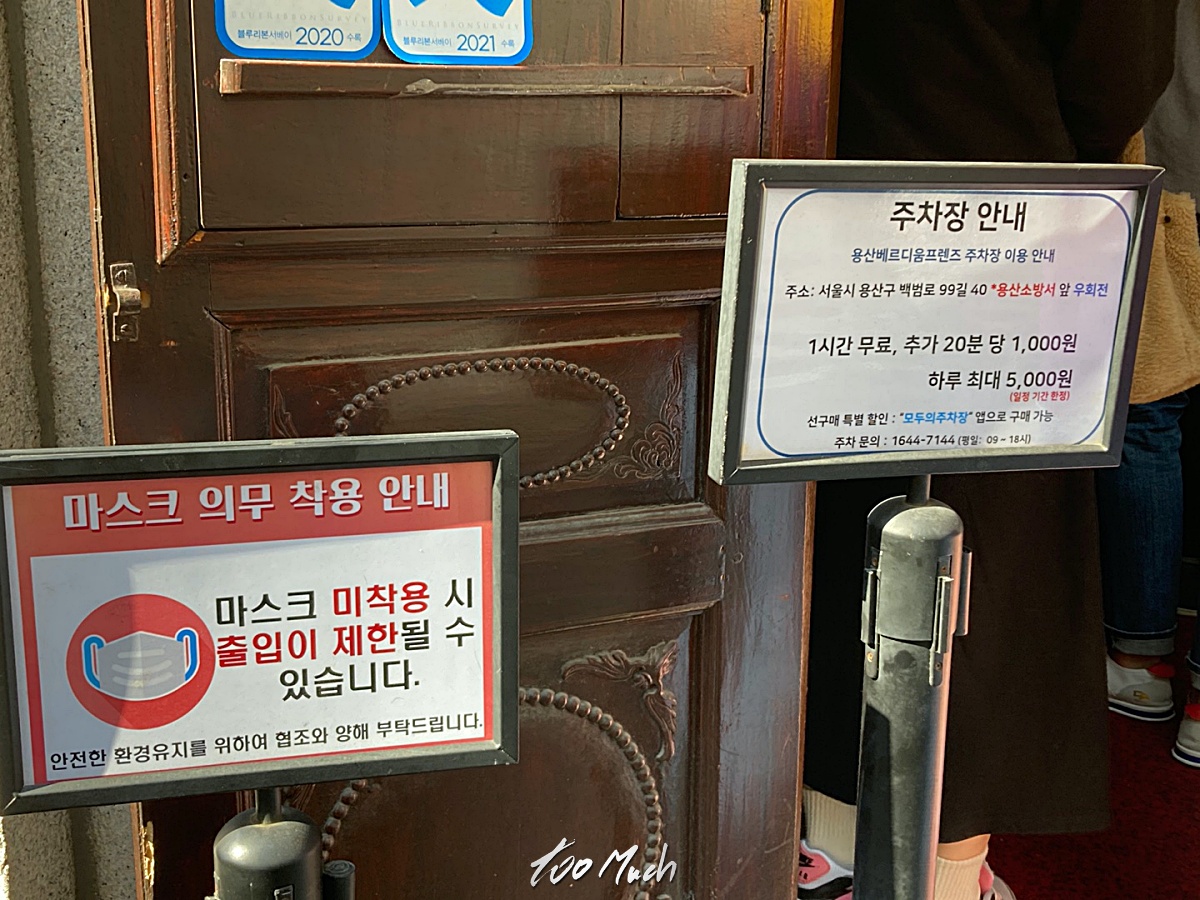 주차 : 주변 용산베르디움프렌즈(용산구 백범로 99길 40 용산소방서 앞 우회전) 주차장 이용