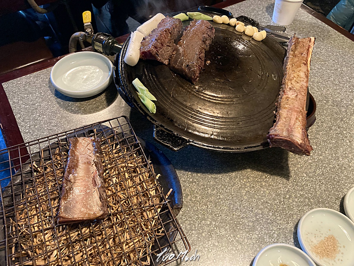 다 익은 고기는 이렇게 직원분이 뼈 위에 올려준다. 우선, 첫 한점은 아무것도 찍지 않고 그냥 먹어보라고 해주는데, 입안으로 우대갈비 한조각을 넣는 순간, 양념된 단맛과 갈비의 육즙이 순간적으로 입안에서 폭발한다. 그냥 육즙의 향연이다. 눈을 지긋이 감고 천천히 어금니로 한입 한입 씹어보게 된다. 씹어볼 때마다 어금니 사이로 터져나온 육즙이 혀와 입천장을 적시고 콧구멍이 벌렁거리면서 행복해진다. 그리고 이렇게 한마디가 나온다.