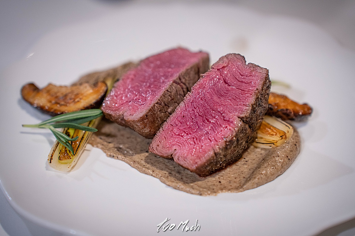 그리고 기다렸던 안심스테이크. 스테이크의 익힘 정도를 따로 묻지 않아서 살짝 걱정했지만, 너무나도 맛있는 미디움 레어로 정말 맛있게 익혀 나왔다. 고기의 질도 상당히 좋은 편으로, 호주산을 사용하고 있었으며, 너무나도 부드럽게 썰리고 씹힌다. 소스는 계절마다 조금씩 바뀌는 것 같다. 이번에는 블루치즈 버섯퓌레가 나왔고, 스테이크와 함께 훈연파와 표고버섯이 나왔고, 트러플 소금이 함께 곁들어져 있는데 그 맛이 기가 막히다.