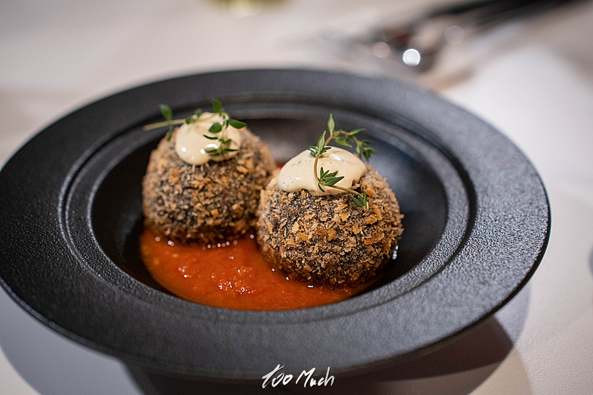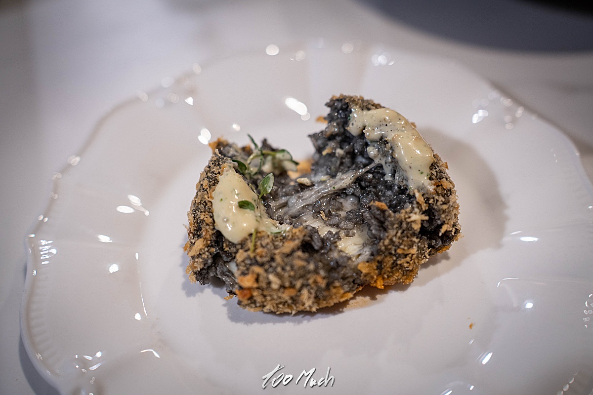 고구마칩이 나온 이후로 아란치니가 나왔다. 오징어먹물 리조또 안에 치즈를 넣어 튀겨낸 아란치니! TV 에서 보고, 이탈리아 여행을 가면 꼭 먹어보겠다고 생각이 들었는데, 진짜 맛있었다. 이 아란치니의 아래에는 토마토 퓨레가 있는데, 겉은 바삭하면서 속은 뜨거우니 여유있게 먹으면 좋겠다.