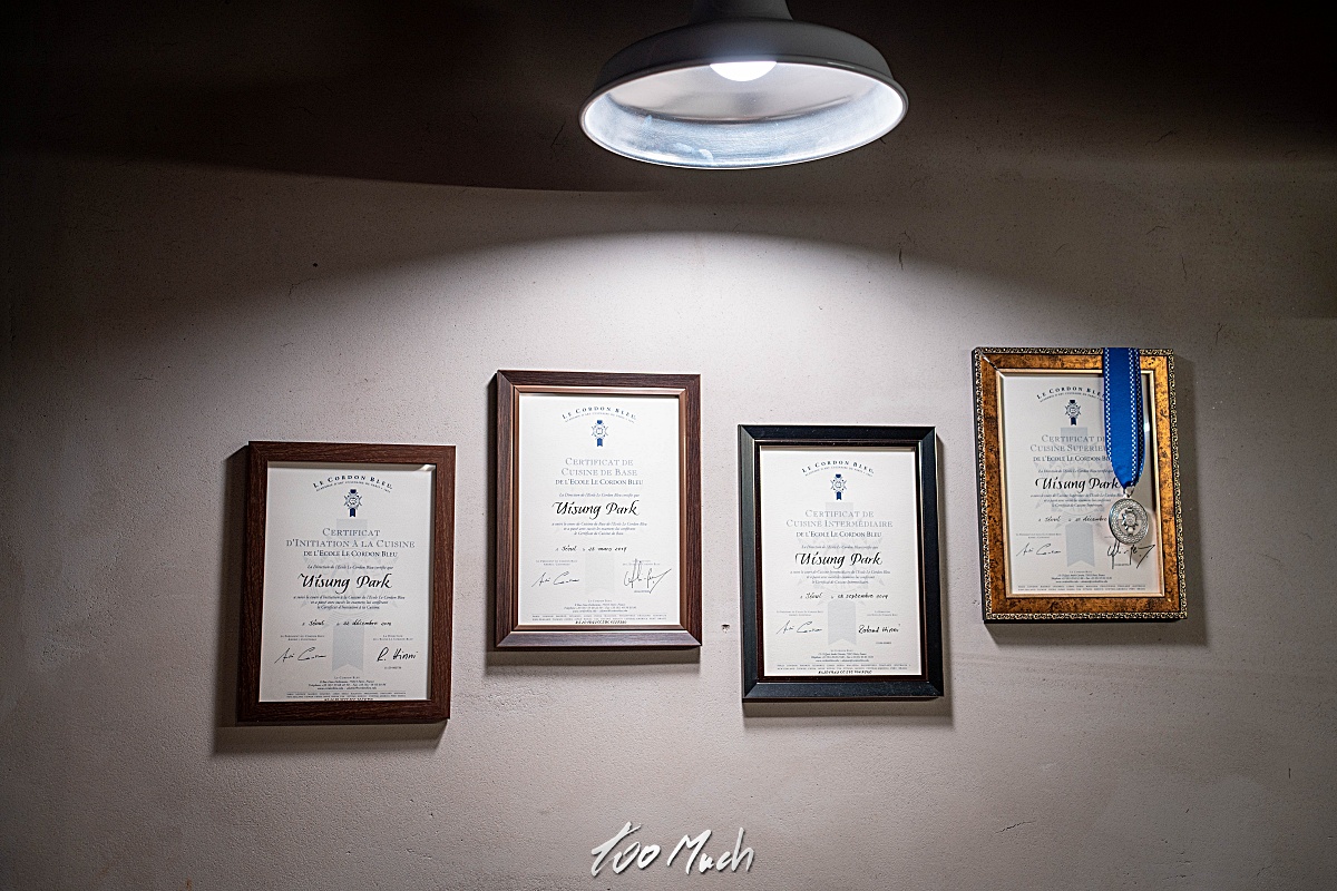 그리고, 벽 한켠에는 르 꼬르동 블루 출신임을 알려주는 증서들이 있는데, 세계 3대 요리학교를 나왔따고 하니 신뢰감이 갔다. *르 꼬르동 블루. 이곳에서 수료를 했다는 것은 기본적으로 요리의 맛에 대해 큰 걱정을 할 필요가 없다는 것을 말하기도 한다. 르 꼬르동 블루(Le Cordon Blue) 는 프랑스의 요리 학교로, 1895년에 파리에서 설립된 역사 깊은 요리학교다. 한국에는 숙명여대에 한국 분교를 두고 아카데미를 운영하고 있다. 잠깐 르 꼬르동 이야기를 해보자면, 르 꼬르동 블루'라는 이름은 "푸른 수장(綏章)"이라는 뜻이다. 프랑스의 왕 앙리 3세가 프랑스의 가장 중요한 기사단 중 하나로 꼽히는 "성령의 기사단"을 결성한 16세기 이래로 최고의 만찬을 의미하는 이름으로 처음 사용되었다. 기사단의 화려하고 성대한 의식과 최고의 만찬으로 인해 르 꼬르동 블루라는 이름이 점차 널리 알려지게 되었으며 1895년 르 꼬르동 블루는 저널리스트 겸 출판업자인 마써 디스텔에 의해 파리에서 설립되었다. 1896년 1월 14일 르 꼬르동 블루 잡지와 요리 학교를 홍보하기 위해 전기 스토브를 이용한 첫 요리 시연 강의를 선보이게 되었고, 이 후로 르 꼬르동 블루는 국제적인 명성을 쌓기 시작했다.