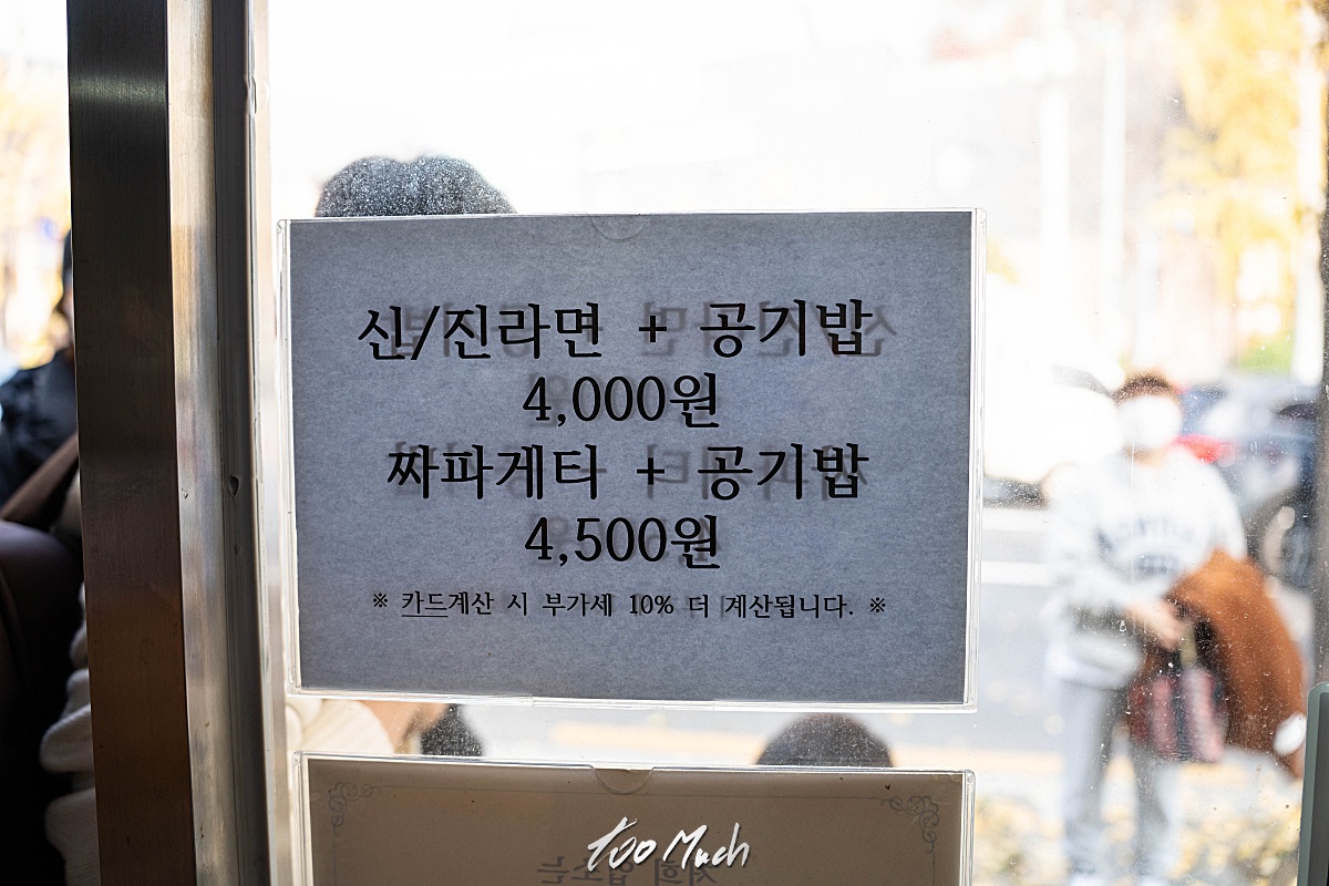 메뉴는 이게 다가. 신라면 혹은 진라면 + 공기밥이 4천원이고, 짜파게티와 공기밥은 4,500 원이다. 짜파게티가 500원 더 비싸다.