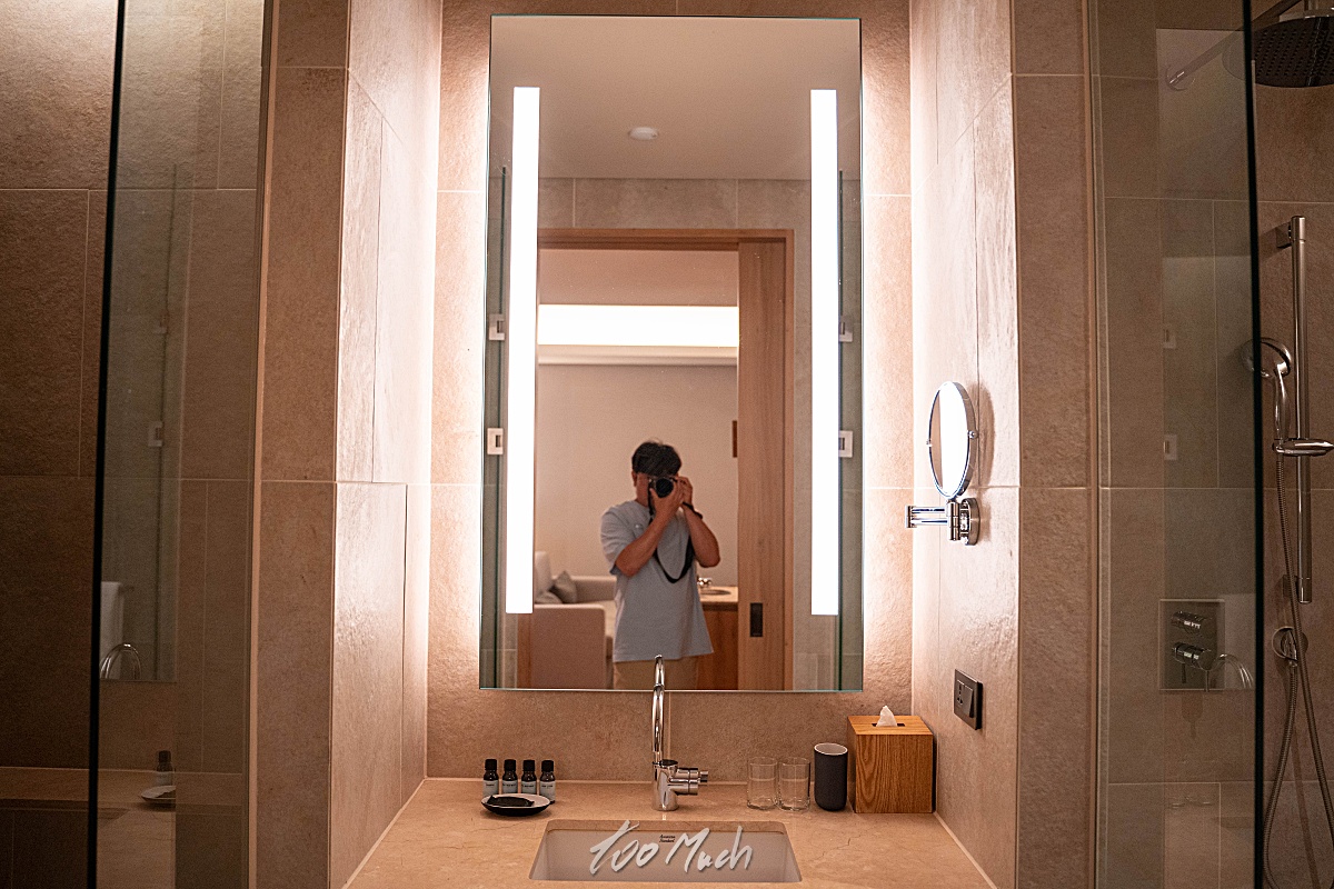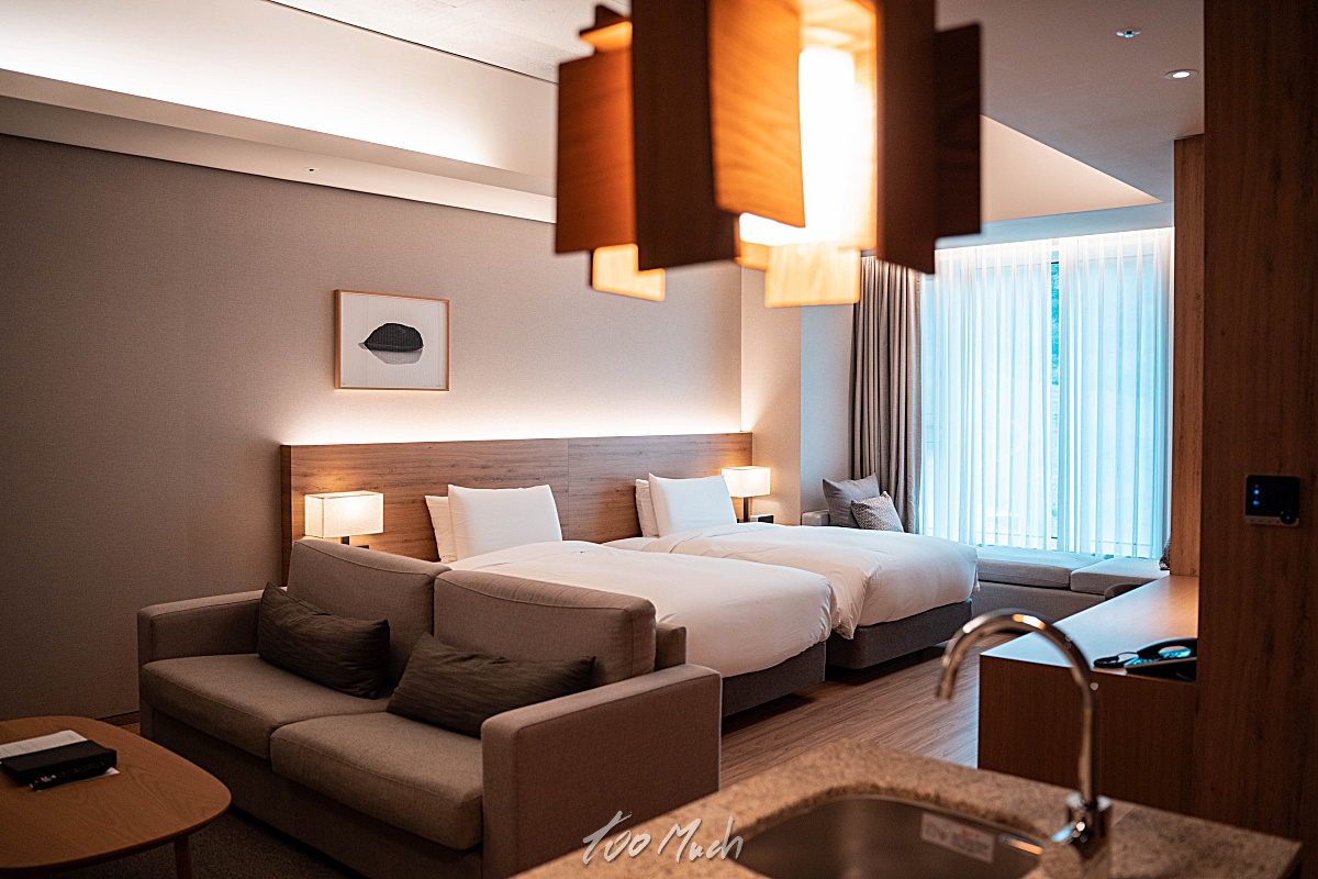 객실 내부는 이렇게 생겼다. 간단하게 주방같은 공간도 있고, 화장실은 은은한 조명과 함께, 전체적으로 깔끔한 인테리어가 눈에 띈다.