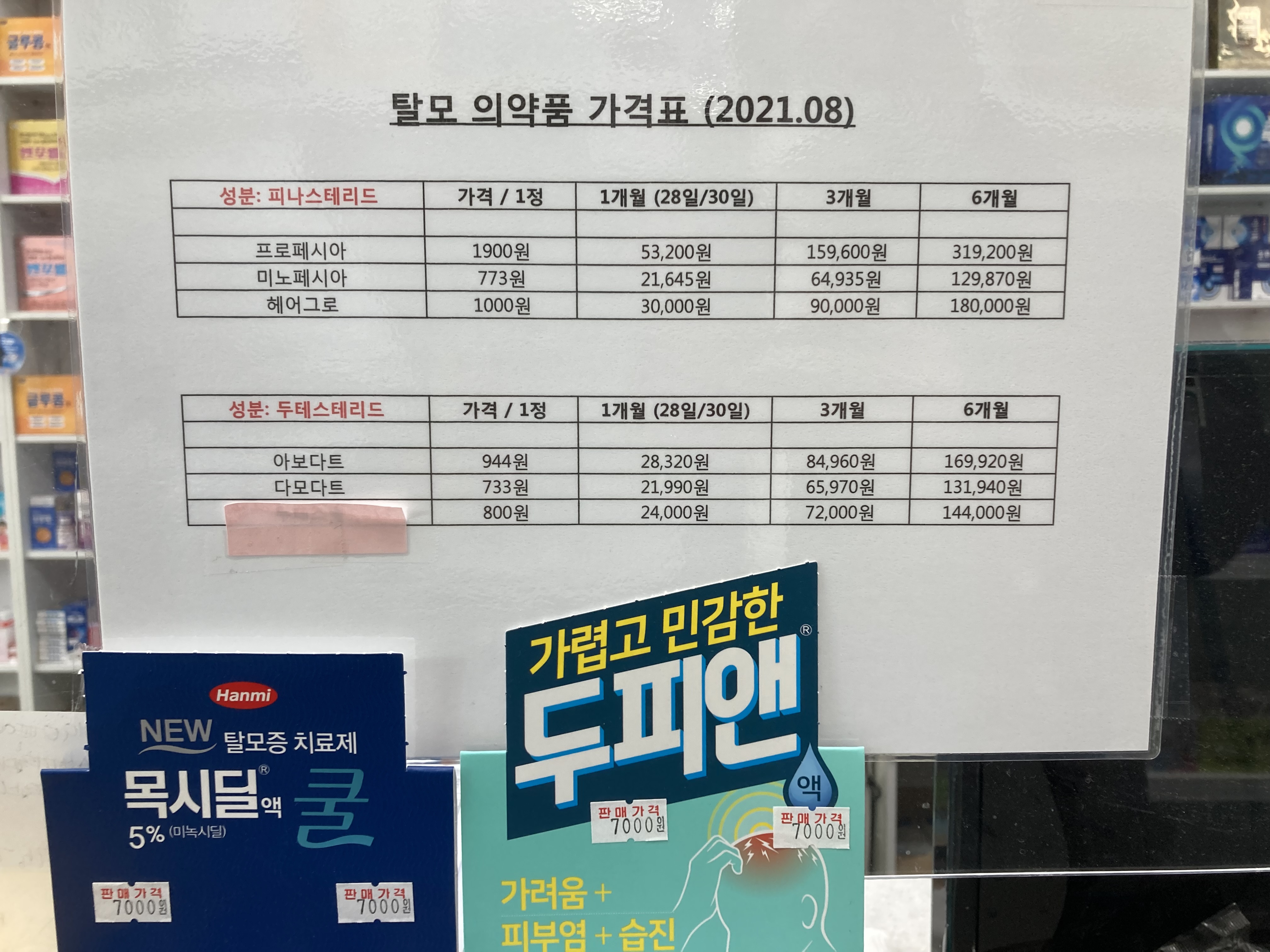 파스는 4개 만원으로 판매중이고 탈모약도 가격 경쟁력이 있어서 붙여놓은 듯하다. 프로페시아, 미노페시아, 헤어그로, 아보다트, 다모다트 나에게는 생소한 이름들 이지만 하남 미사에서 저렴한 탈모약을 찾는 분들께 도움이 되길 바란다.