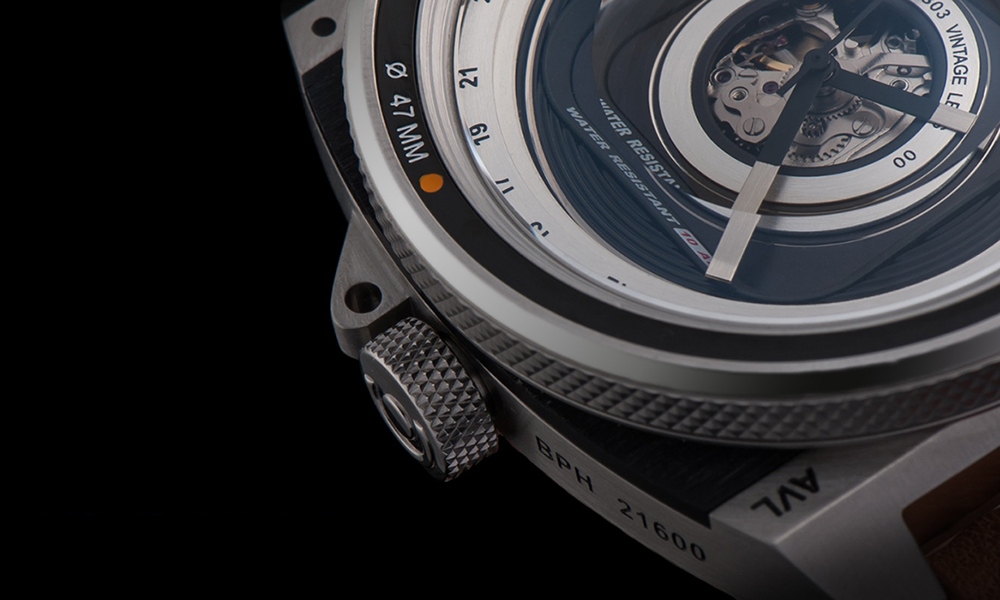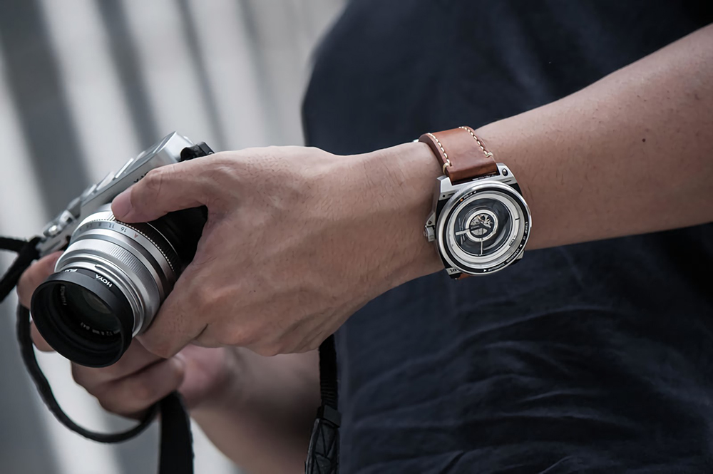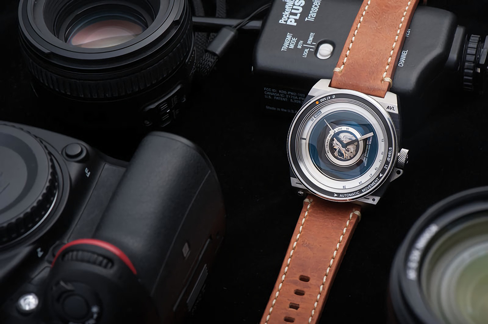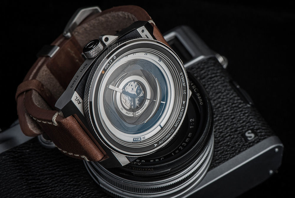 카메라의 렌즈에서 영감을 받아 만든 시계가 있다. TACS 에서 만든 AVL(Automatic Vintage Lens) 2 는 이름에서처럼 카메라 렌즈에서 영감을 받아 만들었는데, 베젤 크기가 47mm 로, 마치 카메라 렌즈 화각인 것처럼 표시되어 있꼬, 시간을 표시하는 12~28 각인 역시 조리개값처럼 보여진다. 더 특이한 점은 카메라 조리개를 움직이듯, 베젤도 회전이 가능하다는 것이다. 그리고, 아날로그 카메라처럼 손맛을 위해 태엽을 사용하고 있다.