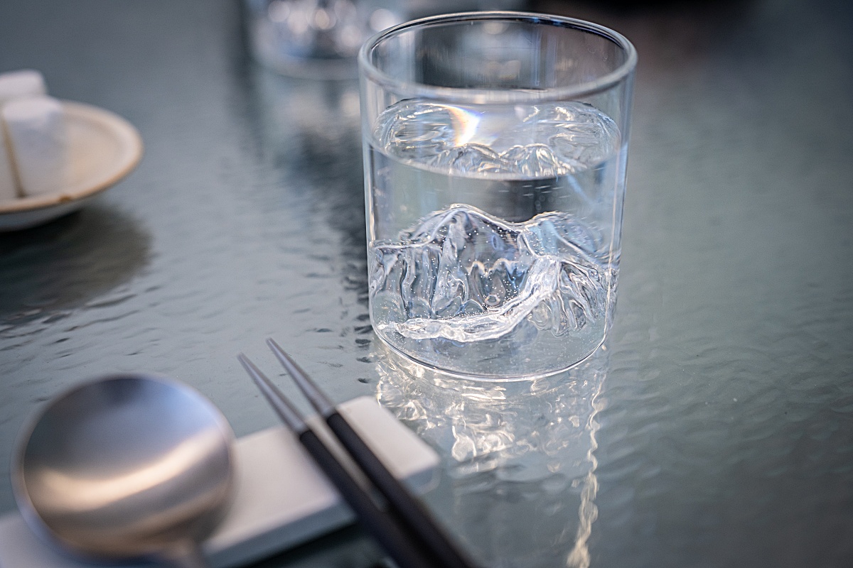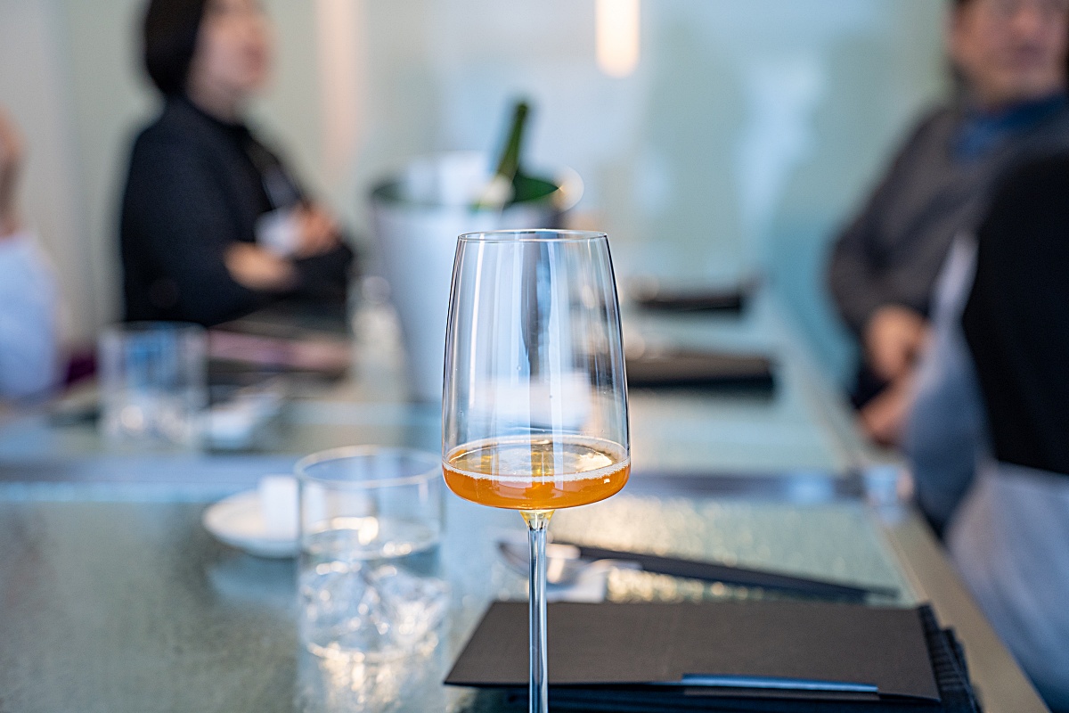 미리 예약을 해놓고 자리에 앉으니, 독특한 물잔과 함께 주문한 와인을 내왔다. 주문은 화인은 프랑스산 와인으로 사과향이 들어간 조금 단맛의 화이트 와인으로 오늘 나올 메뉴와 잘 어울리는 편이었다.