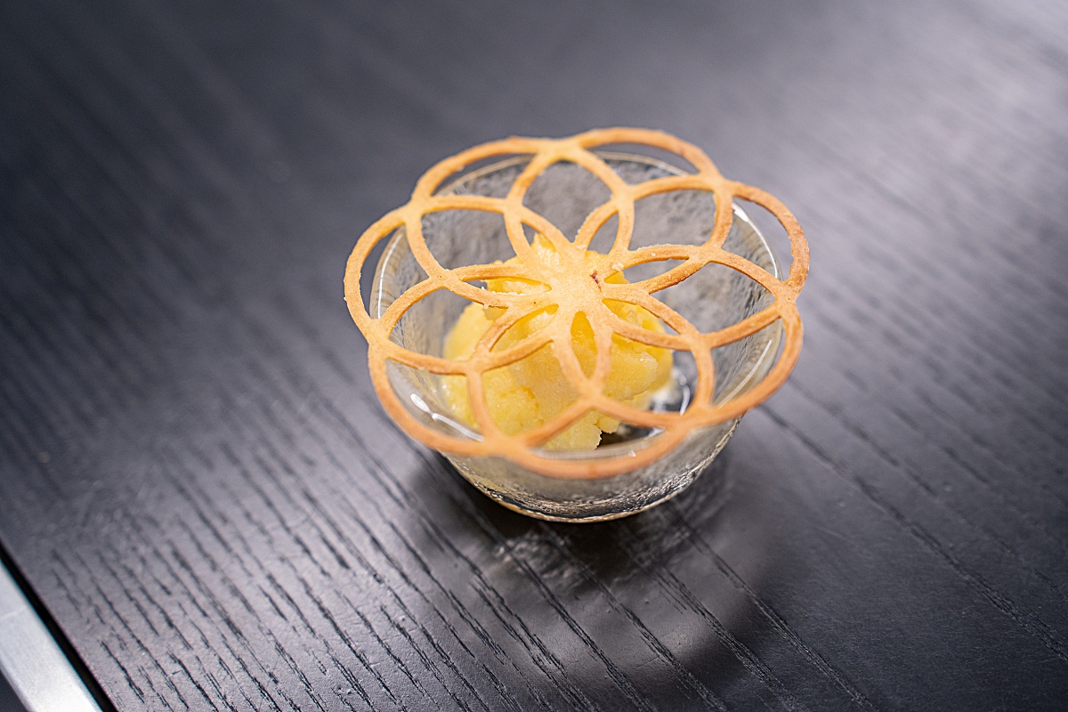 그리고, 중간에 입가심을 위한 한라봉샤베트 위에는 예쁘게 조각된 감자튀김(?) 이 재밌는 식감과 함께, 다음 요리를 위한 입가심을 하기에 충분했다. 충분히 대화를 하면서 천천히 식사를 즐기기에 딱 좋은 곳이었다.