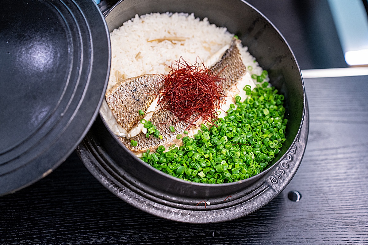 이어서 참돔과 함께하는 솥밥! 솥밥 위에 참돔이 올려져 있고, 잘게 썬 쪽파가 비쥬얼 좋게 올려져 있다. 이제 솥밥을 구경하고 나면, 참돔의 살만 발라내어 섞어내 밥을 담아주는데, 눈으로부터 즐기는 이 즐거움이 참 좋다.