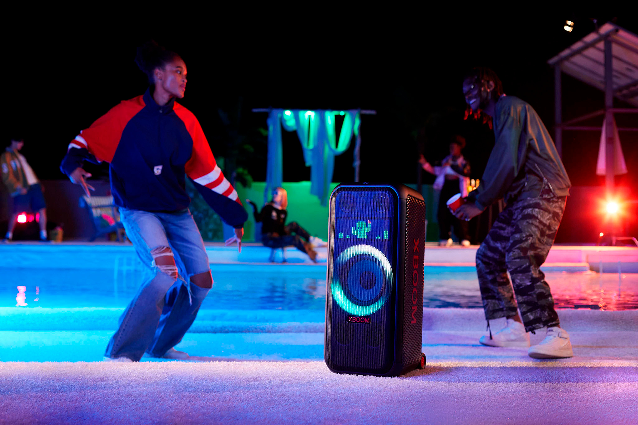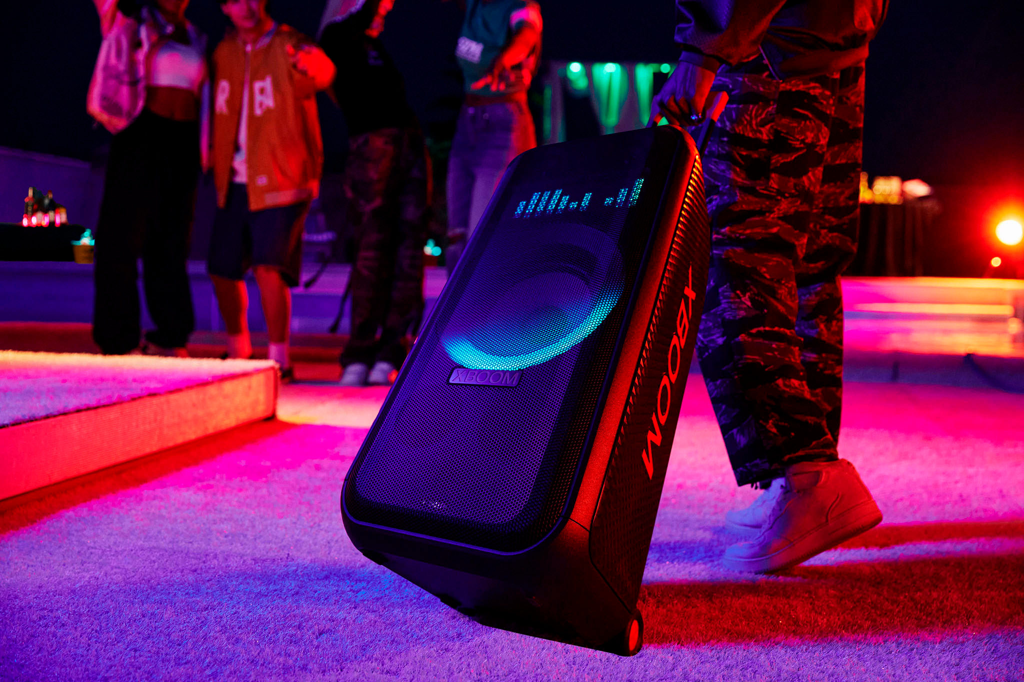 LG 엑스붐에는 고음용 트위터 2개와 저음용 8인치 대형 우퍼 1개. 그리고 2.1 채널에 맞춰 최대 250W 의 강력한 사운드를 내며, 우퍼 조명의 색상이나 점멸 패턴 등을 바꾸고, 픽셀 조명을 통해 영어 텍스트나 캐릭터 애니메이션도 보여줄 수 있어 다양한 부위기 연출이 가능하다. 또한, USB 와 블루투스 모바일 기기로 연결도 가능한데, 각각 200W 급의 XL5S 와 250W 급의 XL7S 두가지 모델을 선택할 수 있다. 가격은 649,000 원이다.