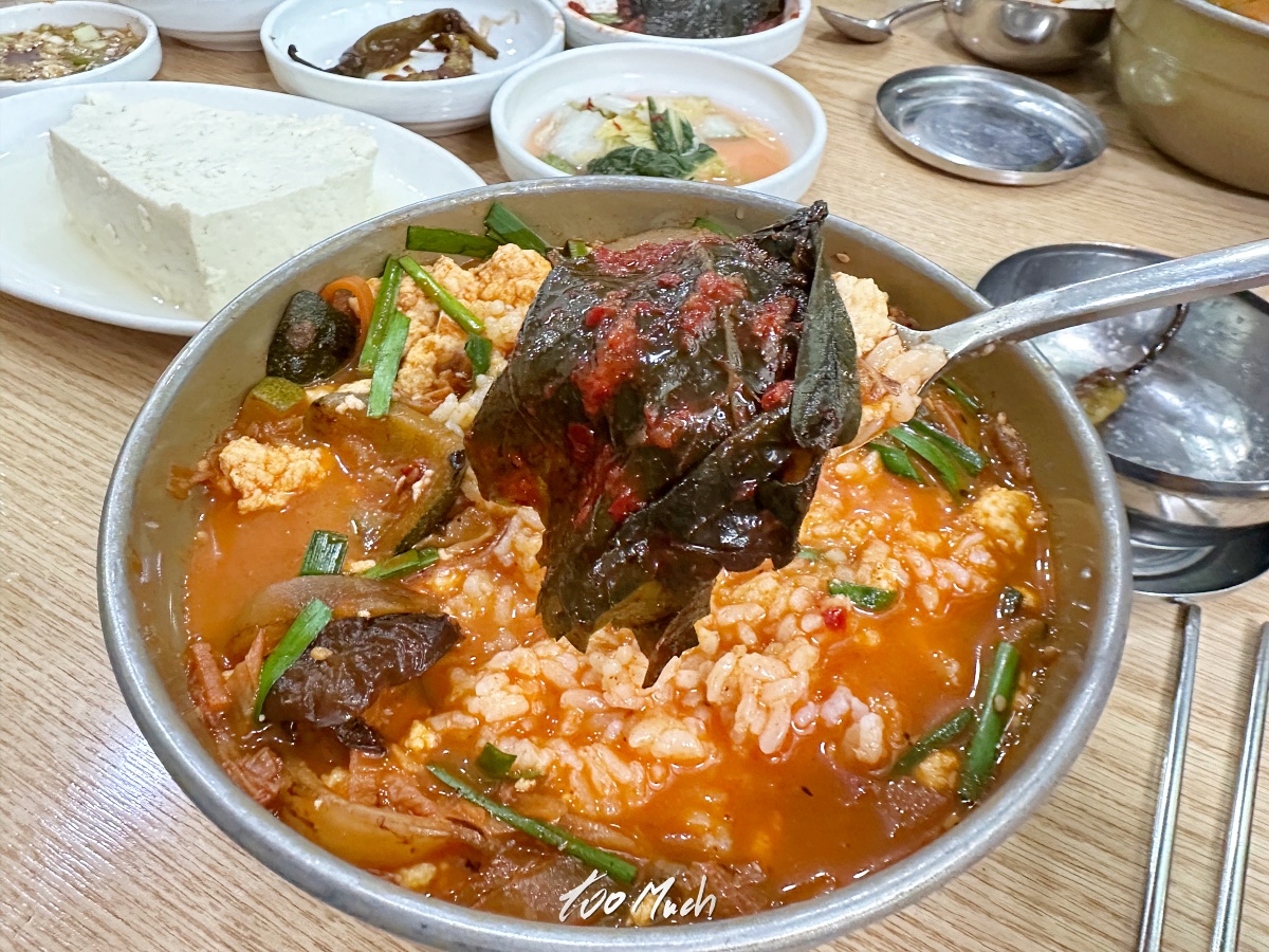 그리고 이 깻잎! 깻잎이 꽤 맛있었고, 고추절임도 맛있었는데, 아마 두부를 주문해야만 나오는 반찬 같다. 다른 반찬들도 좋지만, 특히 깻잎이랑 고추절임 반찬이 맛있어서 두번 리필해서 먹었다. 적당히 매운 얼큰한 불맛의 짬뽕순두부! 짬뽕면을 넣어도 될 것 같은데 밥도 꽤 잘 어울리긴 했다.
