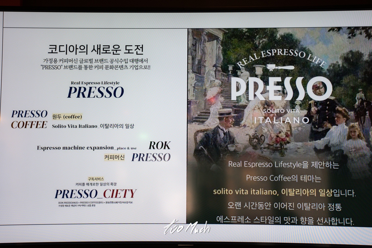 코디아는 새롭게 에스프레소 머신 ROK PRESSO 와 원두를 출시하면서, 에세이스트 김혜지 작가의미발표 에세이를 담은 매거진을 만드는 등, 단순히 제품만 출시하는게 아니라, 홈카페, 홈바리스타 문화를 선도하면서 이탈리아의 일상을 선사하는 테마로 지속적인 고객과의 소통을 이어나갈 것이라고 한다.