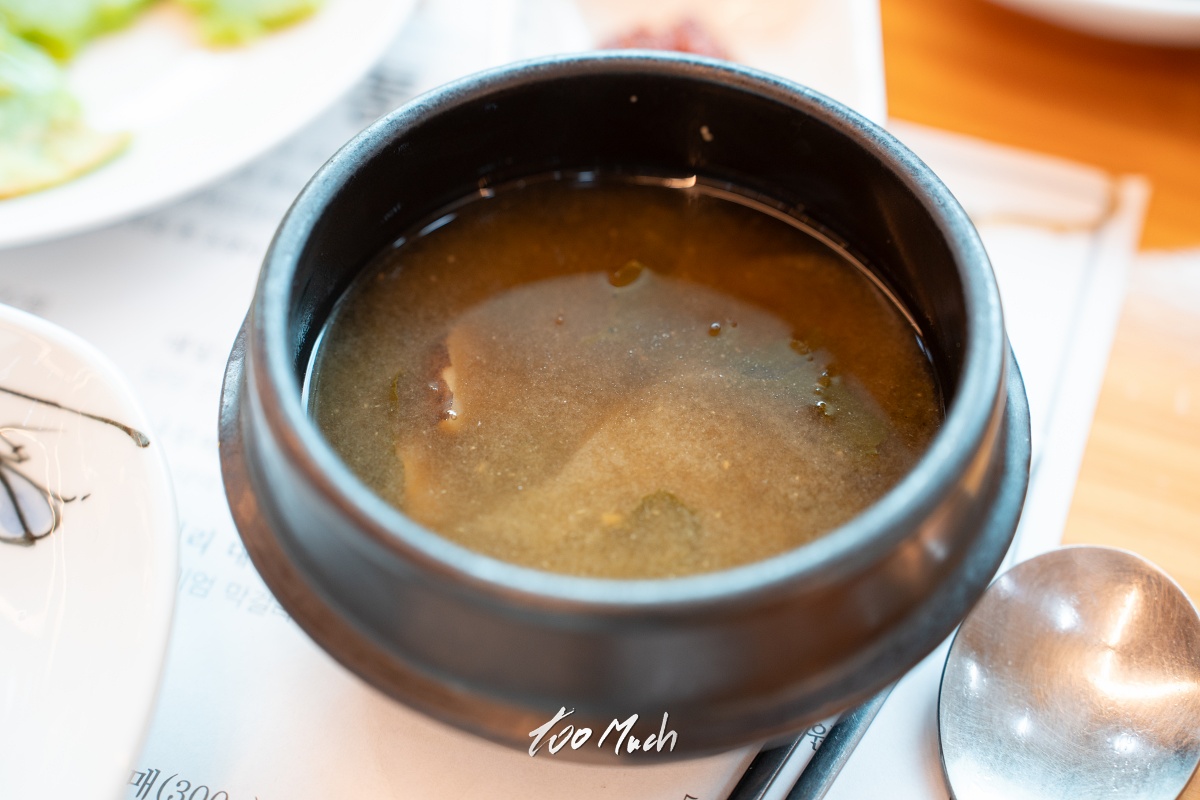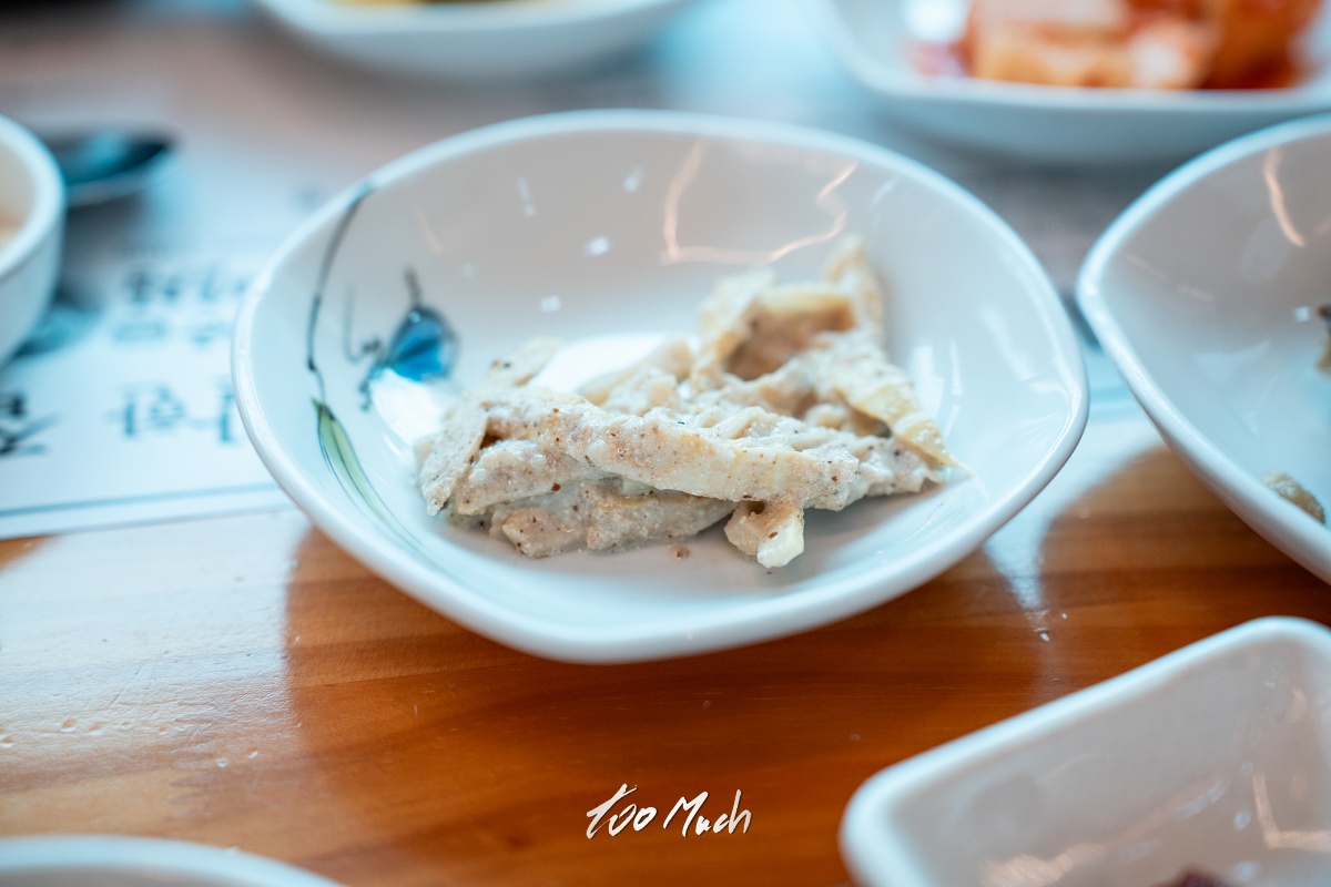 기본 반찬들이 나오는데, 죽순과 우렁을 함께 무친 것과 상추 줄기로 만든 궁채. 여기에 죽순을 들깨양념에 무친 것도 맛있었고, 도토리묵 등 대부분의 반찬이 맛있었다. 특히, 된장국이 맛있었는데, 뜨겁지 않고 적당히 바로 먹기 좋은 온도로 한숟갈 뜨면 속이 편안해진다. 맛있는 된장과 함께 죽순을 넣어 끓여 그 맛이 더 감칠맛이 도는 듯 했다. 그리고 눈길이 특히 가는 반찬이 있었다.
