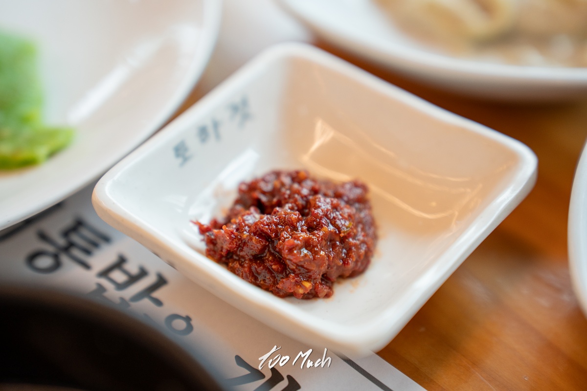 바로 '토하젓' 인데, 1급수에서만 사는 민물새우. 사투리로 '새뱅이' 라고 하는 민물새우로 만든 '토하젓' 이 정말 맛있었다. 우리는 '한상근 정식' 을 시켰는데, 함께 나오는 돼지 숯불갈비에 쌈장이 아니라 이 토하젓을 찍어 먹으니 더 감칠맛이 뛰어났다. 정말 토하젓 최고다.