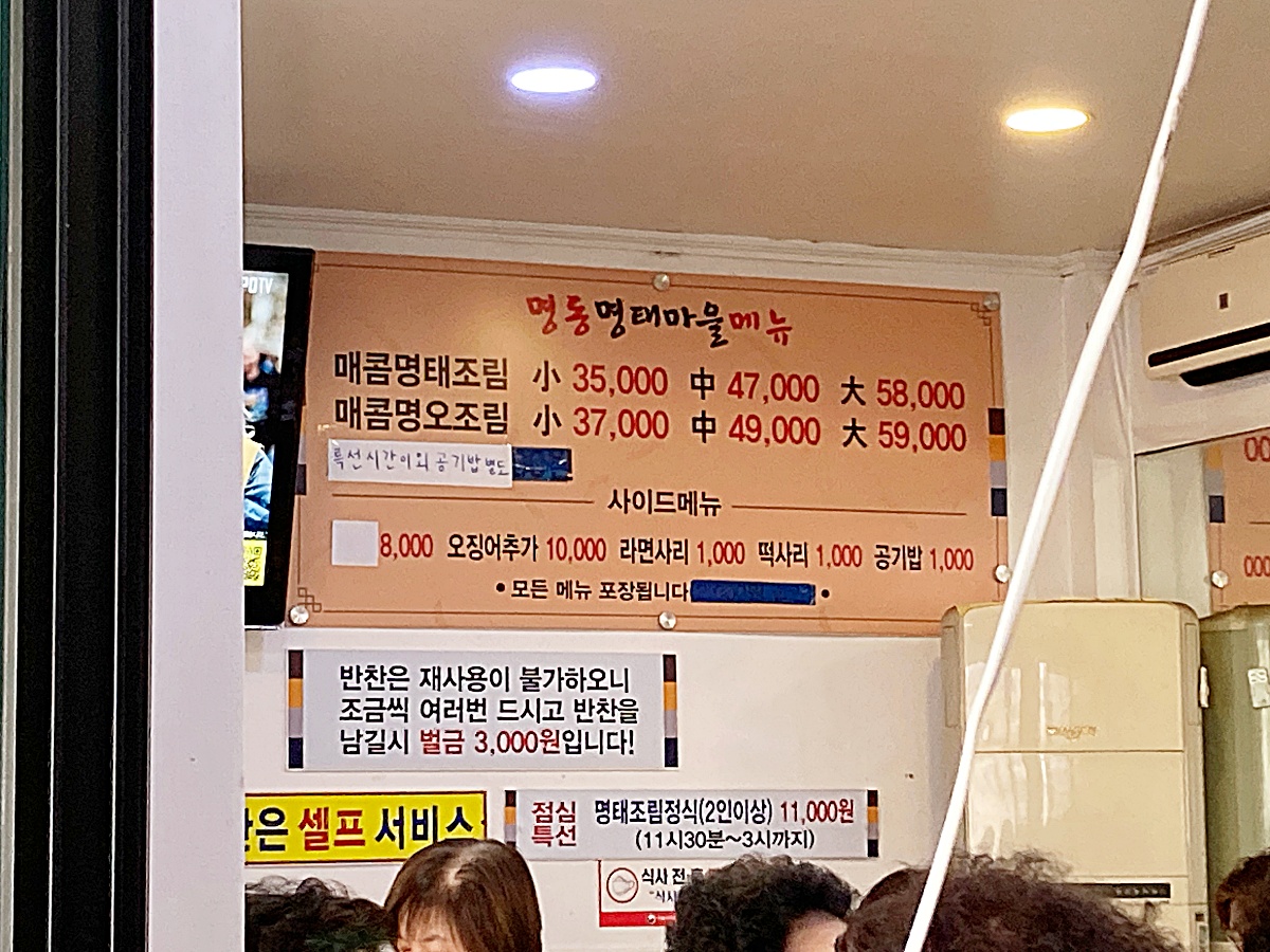 식당 내부는 넓진 않지만, 이곳에서 오래 거주한 찐 로컬이 추천해준 맛집이라는 느낌이 팍 들도록, 점심시간 웨이팅이 좀 있었다. 반찬은 셀프바로 운영되고 있는데, 먹을만큼만 담아야 한다. 남기면 벌금 3천원을 받는다. 그리고, 11 : 30~오후 3시까지 '점심특선' 을 먹을 먹을 수 있는데, 바로 이 점심특선을 먹기 위해 와이프와 함께 다녀왔다. 점심특선은 '명태조림정식' 으로 2인 이상 주문 할 수 있으며, 가격은 11,000 원이다.