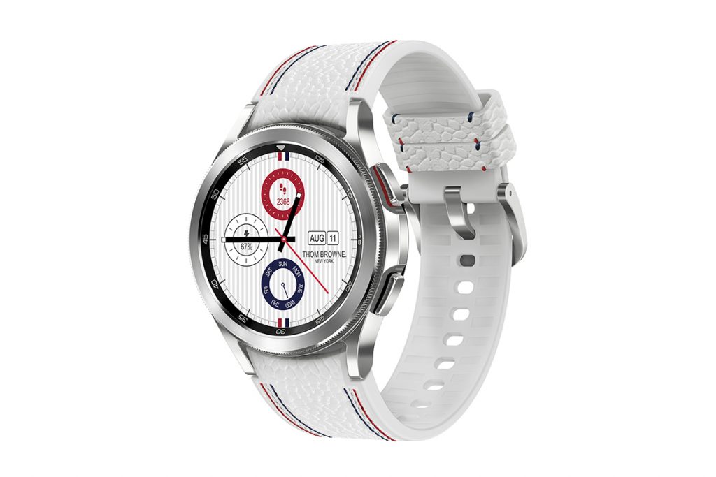 이렇게 따로 구할 수 있는 톰브라운 에디션 갤럭시 워치4는 42mm 의 실버 색상 워치4에 로듐 도금 마감으로 톰브라운 시그니처 디자인을 적용한 것이 특징이며, 워치 스트랩과 충전 케이블도 화이트, 레드, 블루 컬러로 그로그랭 디테일을 적용했다.