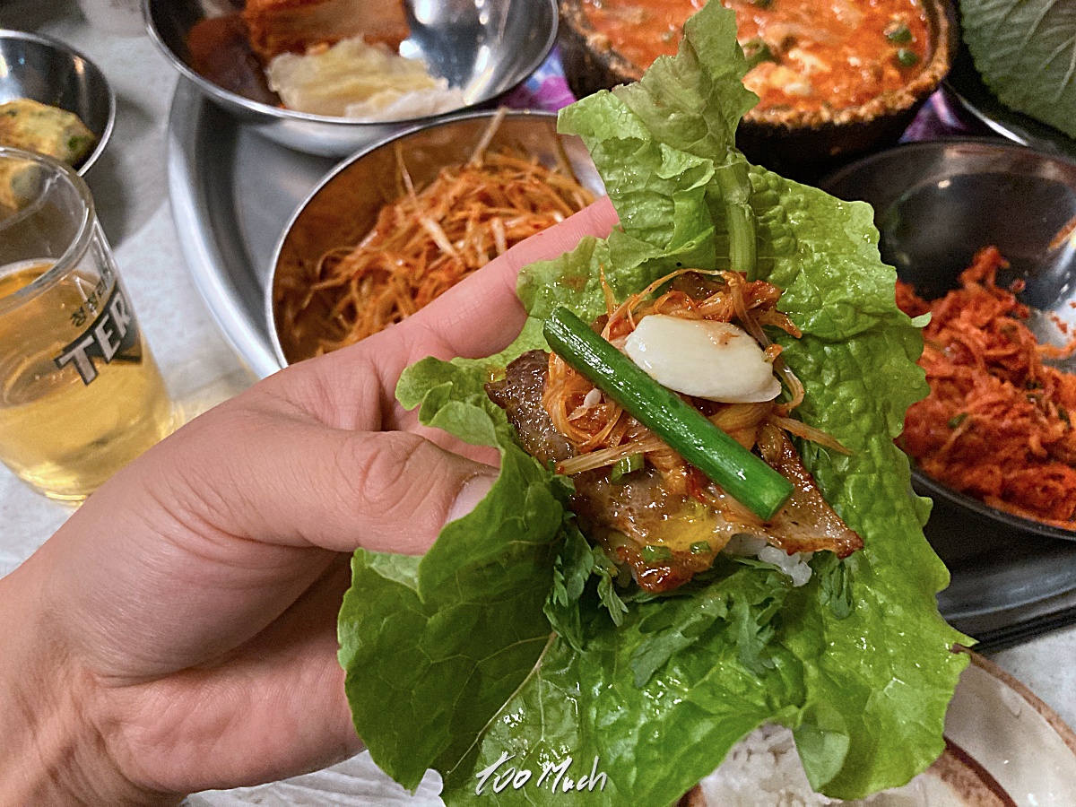 암튼, 고기 위에 마늘쫑과 마늘, 얇은 무채와 묵은지, 파채를 함께 올려 굽고, 스끼야끼 처럼 날계란을 풀어 거기에 고기와 파채를 찍어 구운 마늘쫑을 올려 쌈 싸먹으면 꽤 맛있다. 물론, 두툼한 육즙을 자랑하는 고기가 아니라, 얇은 냉동삼겹살이라 산적처럼 우적우적 씹어먹는 땡땡한 볼은 아니지만, 야채 한가득 건강한 맛으로 볼을 가득 채우게 된다.