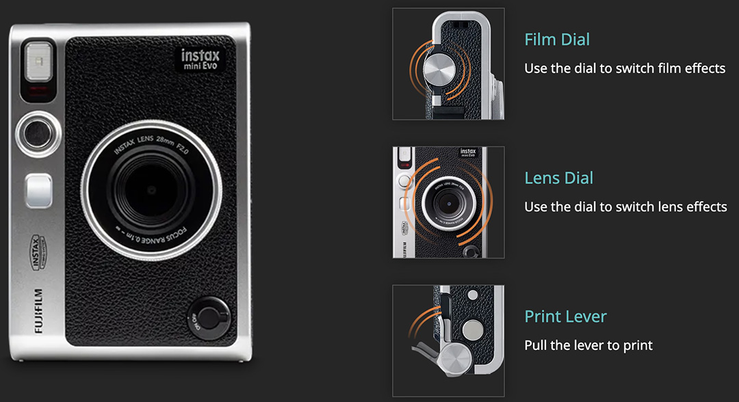 클래식한 디자인은 아날로그 카메라의 디자인을 적용고 있는 인스탁스 미니 에보에는 기본 렌즈 효과와 필름효과가 각각 10개씩인데, 서로 섞어서 100개의 촬영 효과를 조합할 수 있으며, 디지털 카메라와는 다른 아날로그의 감성을 보여주는 것이 큰 특징이다. 여기에 미니 포맷 필름 '스톤그레이' 를 사용하면 더욱 독특한데, 스톤 그레이는 그레이 프레임에 메탈릭 실버로 포인트를 준 필름으로, 다른 인스탁스 미니 시리즈에서도 사용이 가능하다고 하다.