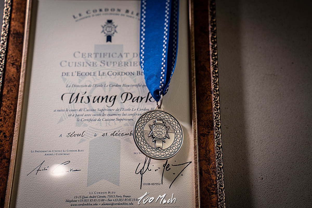 그리고, 벽 한켠에는 르 꼬르동 블루 출신임을 알려주는 증서들이 있는데, 세계 3대 요리학교를 나왔따고 하니 신뢰감이 갔다. *르 꼬르동 블루. 이곳에서 수료를 했다는 것은 기본적으로 요리의 맛에 대해 큰 걱정을 할 필요가 없다는 것을 말하기도 한다. 르 꼬르동 블루(Le Cordon Blue) 는 프랑스의 요리 학교로, 1895년에 파리에서 설립된 역사 깊은 요리학교다. 한국에는 숙명여대에 한국 분교를 두고 아카데미를 운영하고 있다. 잠깐 르 꼬르동 이야기를 해보자면, 르 꼬르동 블루'라는 이름은 "푸른 수장(綏章)"이라는 뜻이다. 프랑스의 왕 앙리 3세가 프랑스의 가장 중요한 기사단 중 하나로 꼽히는 "성령의 기사단"을 결성한 16세기 이래로 최고의 만찬을 의미하는 이름으로 처음 사용되었다. 기사단의 화려하고 성대한 의식과 최고의 만찬으로 인해 르 꼬르동 블루라는 이름이 점차 널리 알려지게 되었으며 1895년 르 꼬르동 블루는 저널리스트 겸 출판업자인 마써 디스텔에 의해 파리에서 설립되었다. 1896년 1월 14일 르 꼬르동 블루 잡지와 요리 학교를 홍보하기 위해 전기 스토브를 이용한 첫 요리 시연 강의를 선보이게 되었고, 이 후로 르 꼬르동 블루는 국제적인 명성을 쌓기 시작했다.