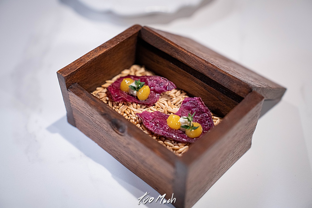 먼저 에피타이저로 고구마칩이 나왔는데, 바삭한 식감의 자색 고구마칩 위로 염소치즈무스와 고구마퓨레가 올라가 있어 본격적인 식사 전 입맛을 자극시키기에 충분하다. 독특하게 오트밀 위에 고구마칩을 올려놓은 것이 인상적이며, 바삭한 식감 뒤로 고구마 퓨레와 고구마칩의 달콤함과 치즈무스의 고소함이 앞으로 나올 메뉴를 기대하게 만든다.