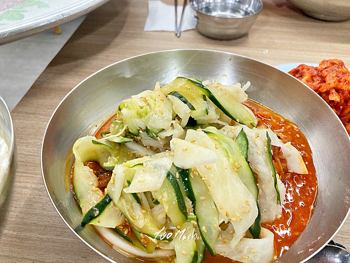 일단, 국수가 나오면 먹기 편하게 면을 잘라주는데, 원치 않으면 미리 말해주면 된다. 하지만 자르는게 먹기 편하다. 비빔국수의 맛은 정말 오묘하다. 그리 맵지는 않은데, 적당히 매콤하면서 너무 달지는 않고, 끝에 살짝 짭쪼롬함이 느껴지면서 자꾸 땡긴다. 고명으로 올라온 오이 등의 채소와 함께 먹으면 아삭한 맛과 함께 질리지 않게 계속 들어간다.