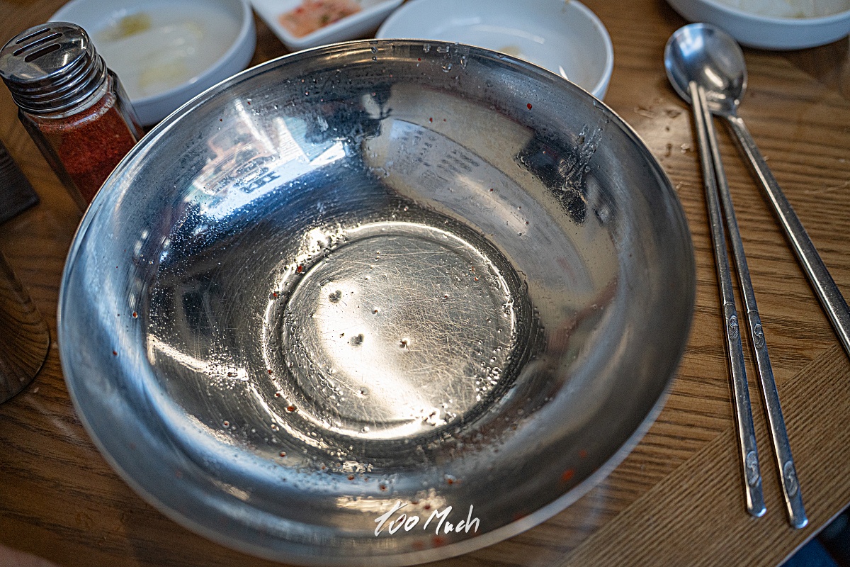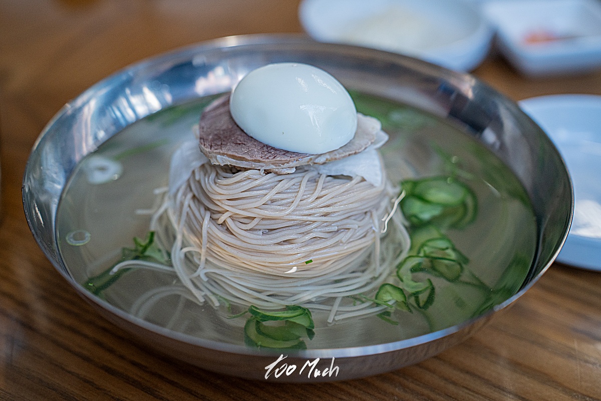 칭찬할 것은 이 평양냉면 물냉면이다. 이제는 파와 오이를 빼기로 했지만, 개인적으로는 오이의 아삭한 식감을 좋아하기 때문에 좀 아쉽지만, 진청수라는 이름처럼 정말 맑은 육수가 매력적이다. 국내산 한우와 한돈을 사용해 우려낸 육수는 소금으로 간을 해 투명함을 완성시켰다. 육수를 우리고 나면 나오는 부스래기도 없어 마치 애니메이션 '토리코' 에 나오는 '센츄리스프' 가 이런 맛일까? 하는 상상도 들 만큼 은은한 감칠맛과 청량함이 짜증과 속상함을 내려준다. 차가운 살얼음으로 맛이 어떤지 알 수 없고, 면의 맛마저 해치는 그런 냉면이 아니라서 더욱 시원하다. 빼기라는 철학을 정말 잘 적용해 완성도를 매우 높였다는 점에서 감탄스러웠다. 심지어 여긴 역사가 깊은 곳이 아닌 신생 냉면집인데 말이다.
